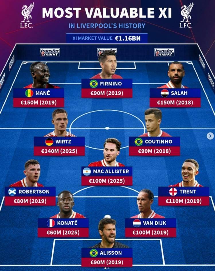 德转列利物浦&阿森纳队史身价最高阵:红箭三侠、萨卡、赖斯在列